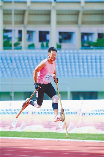 立竿、上脚、起跑,一眨眼的工夫,人便冲到了七八米外。仅靠两根细竹,大多数人站都站不住,但参加板鞋竞速项目的运动员却能健步如飞。