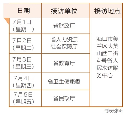 根据安排,7月1日至5日,省财政厅、省人力资源和社会保障厅、省教育厅、省卫生健康委、省民政厅相关负责人将在海南省海口市美兰区大英山西二街4号省人民来访服务中心接访群众。