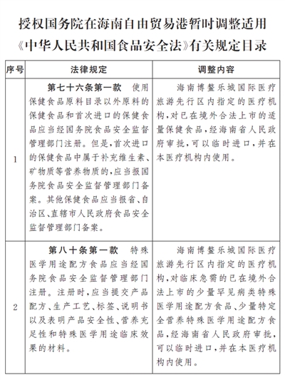 为支持海南全面深化改革开放,推动海南自由贸易港政策落地,第十四届全国人民代表大会常务委员会第十次会议决定:授权国务院在海南自由贸易港暂时调整适用《中华人民共和国食品安全法》有关规定(目录附后),期限为五年,自本决定施行之日起算。海南省人民政府应当按照权责一致的原则,领导、组织和协调相关保健食品、特殊医学用途配方食品安全的监督管理工作,明确审批的具体范围、条件和程序,健全事中事后监督管理制度和应急处置机制,承担相关监督管理职责,加强监督管理能力建设,有效防控风险,确保食品安全,切实维护人民群众身体健康和生命安全。具体管理办法由海南省人民政府制定,经国务院食品安全监督管理部门同意后实施。国务院及其有关部门应当加强指导、协调和监督,及时总结工作经验,并就暂时调整适用有关法律规定的情况向全国人民代表大会常务委员会作出报告。
