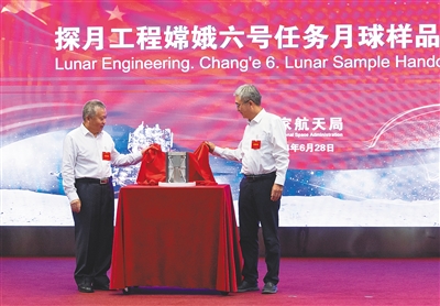 6月28日,国家航天局局长张克俭(左)和中国科学院副院长丁赤飚为嫦娥六号月球样品容器揭开“面纱”。新华社发