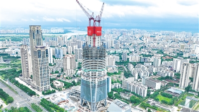 6月25日,海口市国兴大道,正在建设中的海南中心项目格外显眼,目前,该项目核心筒施工已至50层、外框钢结构施工至42层、建设高度达到217.6米。