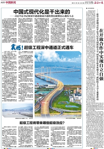 “要想富,先修路”“逢山开路、遇水架桥”。以深中通道为代表的超级工程,通过基础设施“硬联通”带动发展建设“软联通”,充分发挥交通开路先锋作用。我们有信心期待,未来将有更多超级工程让中国驶上高质量发展“快车道”。