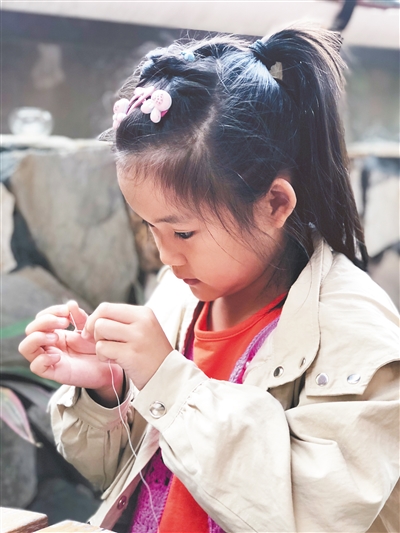 有一期线下活动,大家动手做束口袋,小女孩“悠悠”(现在已是中学生)正在认真地穿针引线。