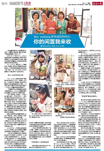 近日,在一个名为“Buy nothing蓝庭松鼠窝”的微信群里,海南日报记者看到不少成员在群里发出消息,免费送出家里的闲置物品,这些消息很快得到群内的其他成员响应。