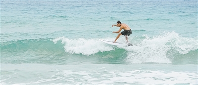 游客在三亚大东海景区冲浪。 海南日报全媒体记者 王程龙 摄