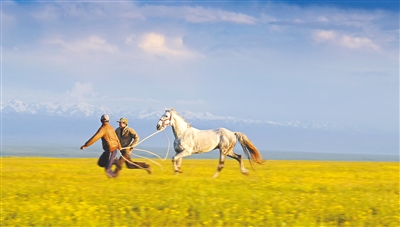 牧马人在油菜花田中牵马奔跑。昭苏县委宣传部 供图