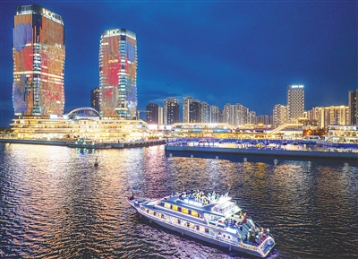 游客乘坐“美兰1号”观光游船,欣赏海口湾夜景。