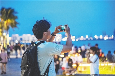 7月2日,众多市民游客乘坐“美兰1号”观光游船,饱览海口湾的美丽夜色。船上的游客在欣赏海湾风光,岸边的众人则悠闲惬意地享受夏日海风。风景文娱两相宜,这是独属于海口湾的松弛感。