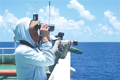 从现场观测看,“海棠”活动离海岸100多海里。此外,这个区域还发现了和短肢领航鲸混游的弗氏海豚,达到数百头海豚和领航鲸交错在一起,“族群之间友好相处,在海上撒欢”。
