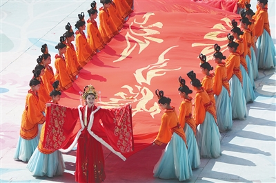 紧接着,身着一袭华丽长裙的“细君公主”登场,与随员组成出嫁车马队伍,她们款款而来,融入到边疆牧民的美好生活里,在生动的幸福劳作场景中,铺展各民族交往交流交融的美好画卷。