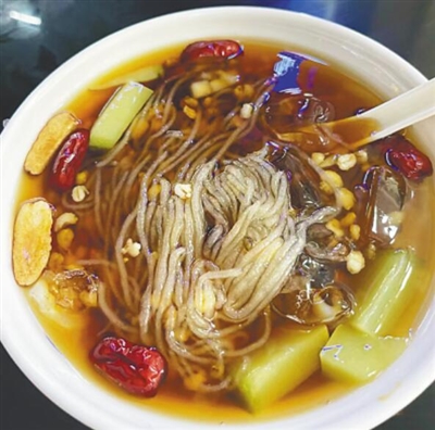在番薯凉粉传统的做法中,番薯粉条一般和仙草膏搭配。具有消暑、清热、凉血功能的仙草被熬制成汁液后,同米浆混合搅拌,便成了晶莹黑亮、冰爽柔滑、韧而不粘的仙草膏。将打碎的仙草膏与姜糖水,加入到番薯粉条中,就成为了美味可口的番薯凉粉。