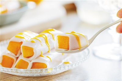 将椰浆与白糖搅拌均匀加热,再加入与清水混合搅拌好的白凉粉,一同煮开后倒入长方形盘中,凉粉结块后切成两半,把长条的芒果包裹其中,摆盘后淋上榨碎的芒果泥,切块……经过一系列工序后,两条肠粉被切成8个小块,半裹着颜色鲜明的芒果,呈现在食客面前。