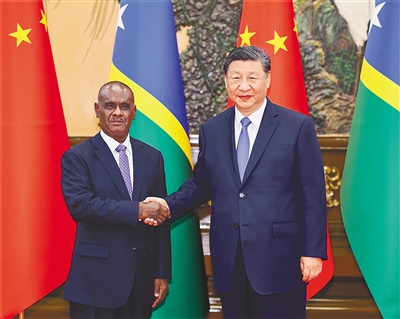 习近平强调,中方始终坚持独立自主和平外交政策,主张各国无论大小、强弱、贫富一律平等。中国同所罗门群岛等太平洋岛国开展友好合作,是真心诚意帮助岛国实现发展,是在“南南合作”框架内的互帮互助,属于“全球南方”共同发展的范畴,不针对第三方,不谋取任何私利。中方愿继续为所罗门群岛实现发展提供力所能及的帮助,加强在联合国、太平洋岛国论坛等多边机构中协调配合,维护发展中国家共同利益。