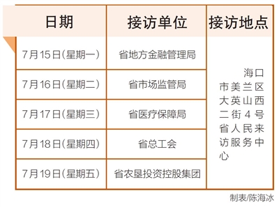 7月15日至19日,省地方金融监督管理局、省市场监督管理局、省医疗保障局、省总工会、省农垦投资控股集团相关负责人将在海南省海口市美兰区大英山西二街4号省人民来访服务中心接访群众。