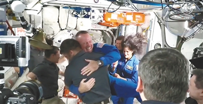 6月6日,美国波音公司“星际客机”飞船与国际空间站对接后,美国宇航员巴里·威尔莫尔和苏尼·威廉姆斯进入国际空间站(视频截图)。新华社/美联