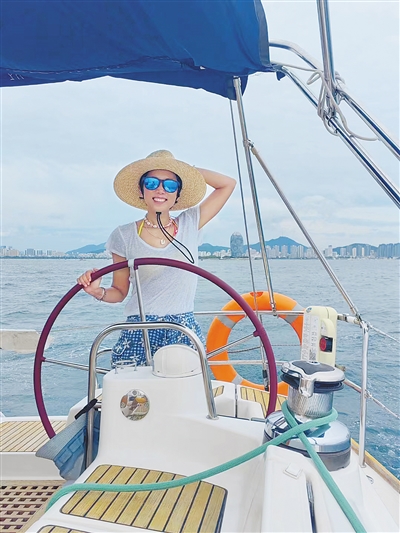 小佳在三亚乘坐游艇。