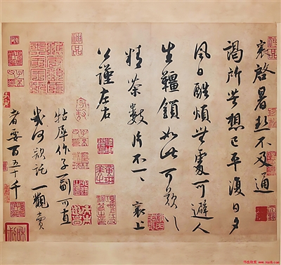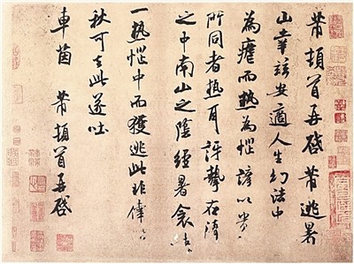 《逃暑帖》是北宋书法家米芾写的一封信,他因暑热选择远离城市,逃到山上避暑去了。此帖藏于海外,由于年代久远、流传保管不善,多个字剥蚀不清、无法辨识,但文意大体完整。寄信对象疑为与米芾交情匪浅的章惇。米芾在夏季进深山,意在享受“南山之阴”,过一段惬意的日子。此帖中的“逃”字一露,整篇意境全出。在酷热难耐的夏季,作者能找到一处清凉的世外桃源,或度假或创作,欣赏美丽的风景,真是人生快事。