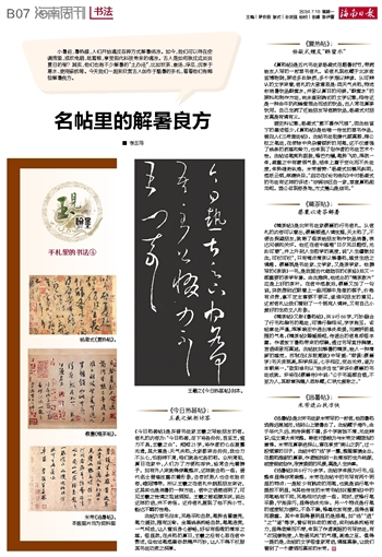 《今日热甚帖》是东晋书法家王羲之写给朋友的信。信札的内容为:“今日热甚,足下将各匆匆,吾至乏,惙力不具,王羲之白”。短短21字,将作者的心态展露无遗,其大意是:天气炎热,大家都来去匆匆,我也力不从心,怕招待不周,咱们就各忙各的吧。众所周知,夏日在家中,人们为了方便和凉快,经常会光着膀子。如有外人来就得穿戴整齐,这样就会热一些。晋代名士普遍注重衣着形象,会客时男人也会收拾妆容,峨冠博带。所以王羲之在信札中婉拒朋友来访,这其实也是消暑的一种方法。信中之语简洁明了,可见王羲之性情之坦诚洒脱。王羲之曾袒腹东床,说出这样的话,并不奇怪。这件信札展现了他不拘小节、豁达不羁的性格。