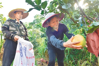 在屯昌蜀昌公司坡心黄金蜜柚基地,工人在采摘柚子。林小丹 摄