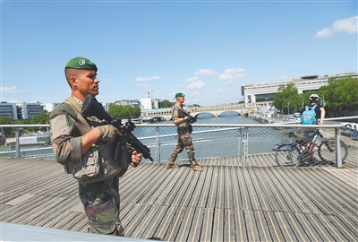 7月17日,士兵在法国巴黎塞纳河上的一座桥上巡逻。新华社/美联