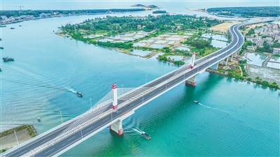 近日,航拍万宁和乐镇港北大桥。港北大桥全长2.472公里,该大桥开通后,不仅方便了群众出行,还把24平方公里的英豪半岛整体纳入了和乐经济中心圈,使英豪半岛与六连岭、港北小海、国家现代渔业产业园和乐片区等一起形成“山海联动”经济发展链条,促进当地经济发展。
