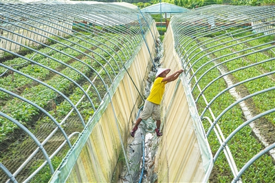 7月21日,琼海市嘉积镇大礼社区农民在蔬菜基地加紧搭建防雨棚。 特约记者 蒙钟德 摄
