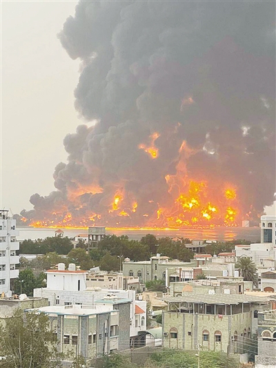 图为也门红海城市荷台达的一处储油设施在遭空袭后引发大火。新华社发