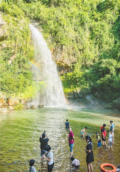 游客在琼海南牛瀑布玩耍。