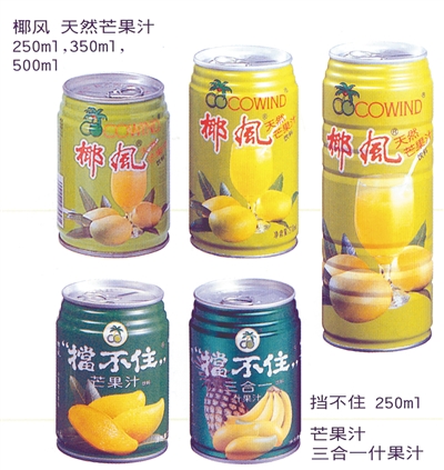 1989年9月,文昌东郊椰子总厂生产出“天然椰子水保鲜饮料”,在当时属国内首创。这款饮料曾被选送至北京参加中国第二届乡镇企业出口商品展览会。成立于1992年的椰风集团生产的芒果汁、三合一什果汁等,曾是畅销的果汁饮料,这几款罐装饮料包装上“椰风挡不住”的广告语,至今仍时常被人提起。此外,海南椰岛集团生产的易拉罐装“椰岛”牌天然芒果汁,很多海南人品尝过。