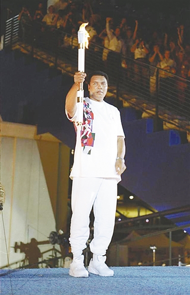 1996年亚特兰大奥运会开幕式上,“拳王”阿里手持奥运火炬。