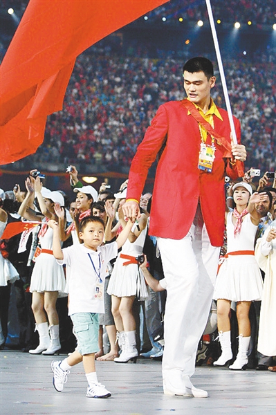 2008年北京奥运会开幕式上,中国代表队旗手姚明牵着来自汶川地震灾区的林浩入场。