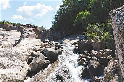 艰难行走约一个小时后,我终于有了意外收获:我发现了一个豁口!从这豁口进去,仿佛进入了一处仙境,河流婉转,清澈见底,奇形怪状的石头星罗棋布般躺在河谷中。历经多年河水冲刷,石头的棱角早已被磨去,表面显得光秃圆滑。河流两岸,山峰连绵,郁郁葱葱,与幽深的河谷构成了一幅优美的山水画。此刻,白云静止,山林肃立,石头坦然,除了河流的声音,好像周围的一切都安静了下来,似乎它们都在屏息聆听一场河流的交响乐。