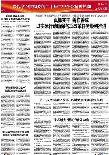 连日来,我省各部门各市县各单位深入学习贯彻党的二十届三中全会和省委常委会(扩大)会议精神,表示将深刻领会、准确把握习近平总书记关于全面深化改革的一系列新思想、新观点、新论断,真抓实干,善作善成,以强烈的历史使命感和责任感推进各项改革任务,进一步加快发展步伐、提升发展质量,把海南自由贸易港打造成展示中国风范的靓丽名片。