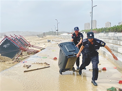 今年第3号台风“格美”7月25日19时50分前后在福建莆田市秀屿区沿海登陆,登陆时中心附近最大风力12级(33米/秒,台风级)。图为7月25日,安保工作人员在福建平潭的一处沙滩公园排除安全隐患。