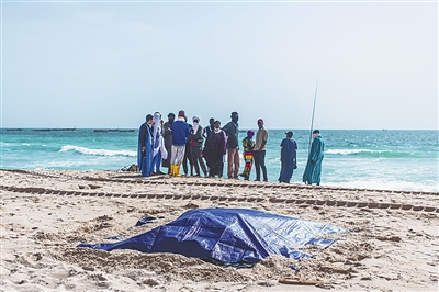 7月24日,在毛里塔尼亚首都努瓦克肖特海边,移民船上遇难人员的遗体被遮盖。