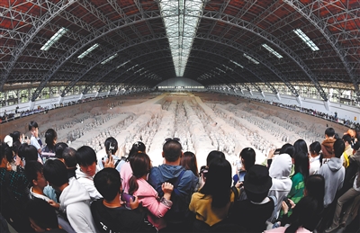 游客在秦兵马俑一号坑遗址内参观。 新华社发