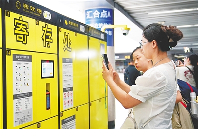 为解决乘客携带行李出行不便的难题,上海地铁首次试点行李寄存服务。7月27日起至8月底,乘客可在12座车站内的24个寄存点,自助进行寄存服务。图为7月27日乘客在上海市人民广场地铁站内自助寄存行李。新华社发