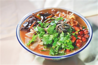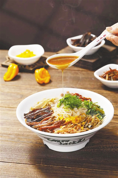 碗里,数种配料堆在细长的粉上,浇上灵魂卤汁和酸汁,再搅拌均匀,入口瞬间,根根米粉裹满了料汁,肉香、菜香、海鲜香交织。“酸爽开胃,根本停不下来!”食客林先生嗦得很是过瘾。