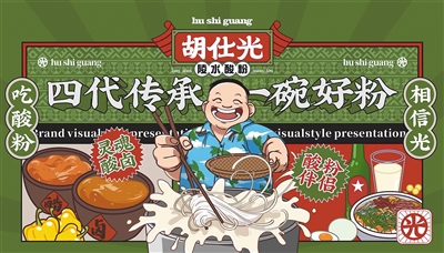 走进胡仕光酸粉店,憨态可掬、满脸笑容的品牌IP形象就是根据他本人形象设计而来。“四代传承,一碗好粉”“吃酸粉,相信光”“一粉、两汁、三菜、四肉”……无论是店面堂食,还是打包外送,装潢、包装的视觉设计均融入了全方位的品牌文化输出。