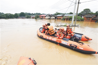 7月28日,在湖南省资兴市唐洞街道镜塘村,救援队员在转移被困群众。