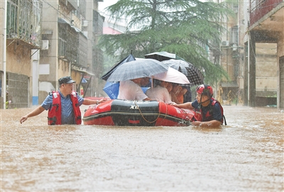 7月28日,在湖南省娄底市双峰县永丰街道一居民小区,民警和救援人员在转移受困居民。