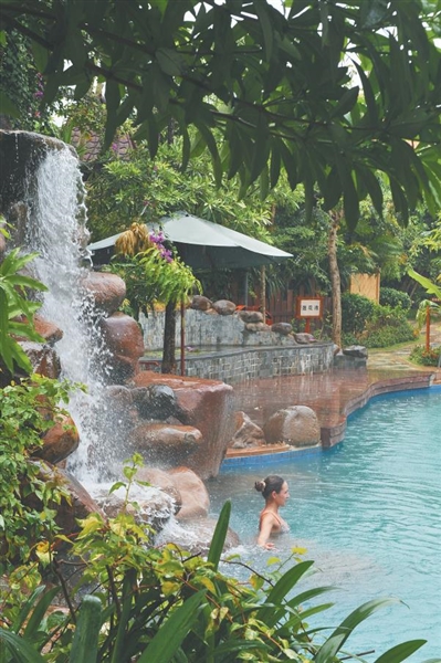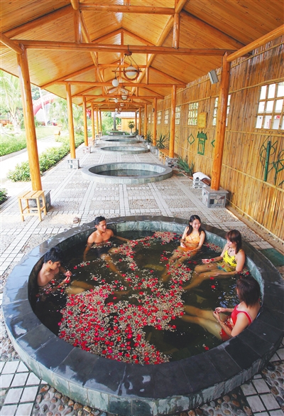 游客在琼海官塘泡温泉。
