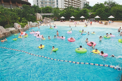 市民游客在海口观澜湖火山岩矿温泉欧洲区戏水。资料图