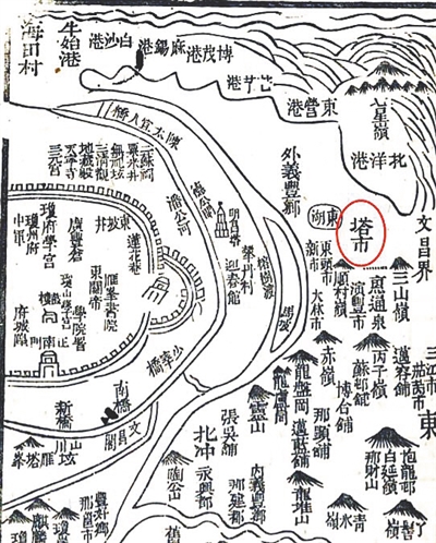 《琼山乡镇概览》又有记载:“本镇北端的塔市墟,是明代一个姓胡的道台,在此高处建一座11层的石塔,塔下设铺集市,人们以塔名墟,故称塔市墟。虽然1967年石塔被毁,但塔市犹存。”塔市周边早建有古塔,地区也因塔得名,不过塔市因哪一座塔得名,如今实难考究。