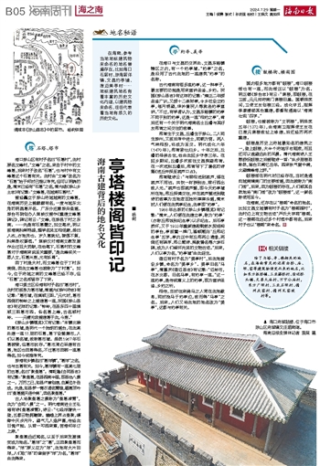 在海南,还存在以“楼阁”命名的地名,比如文昌文城镇有村子名为“楼阁园村”,此村边上有文物古迹“严氏大宗祠”楼阁,这一楼阁在远近多个村落中都有名,后来村子也以“楼阁”来命名。