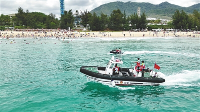 今年五一假期,三亚市公安局亚龙湾海岸派出所民警在海上巡逻,守护游客安全。 通讯员 罗健 摄