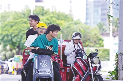 ②在海口海秀路,一辆电动自行车超员载人,并且其中两名乘坐人员没有佩戴安全头盔。