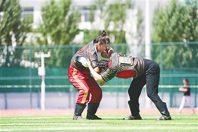 在当天的搏克女子团体比赛中,海南省代表队的年轻女搏克手身姿矫健,动作中饱含技巧和智慧。据了解,在搏克比赛中,先倒地或膝关节及其以上任何部位先着地者则为失败。