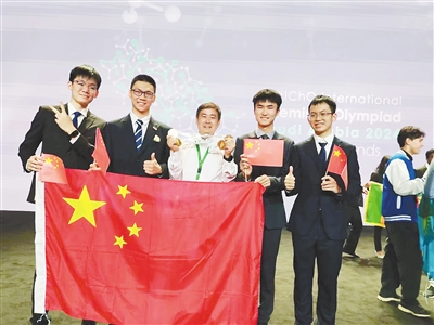 第56届国际化学奥林匹克竞赛在沙特阿拉伯首都利雅得闭幕,钟正(左一)与中国代表队团长及队友合影。(受访者供图)