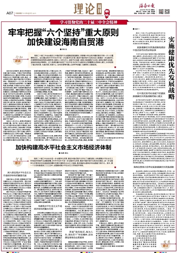 海南是我国最大的经济特区,具有实施全面深化改革和试验最高水平开放政策的独特优势。党的二十届三中全会提出,“加快建设海南自由贸易港”。必须坚持依靠改革开放增强发展内生动力,统筹推进深层次改革和高水平开放,加快推动海南高质量发展。